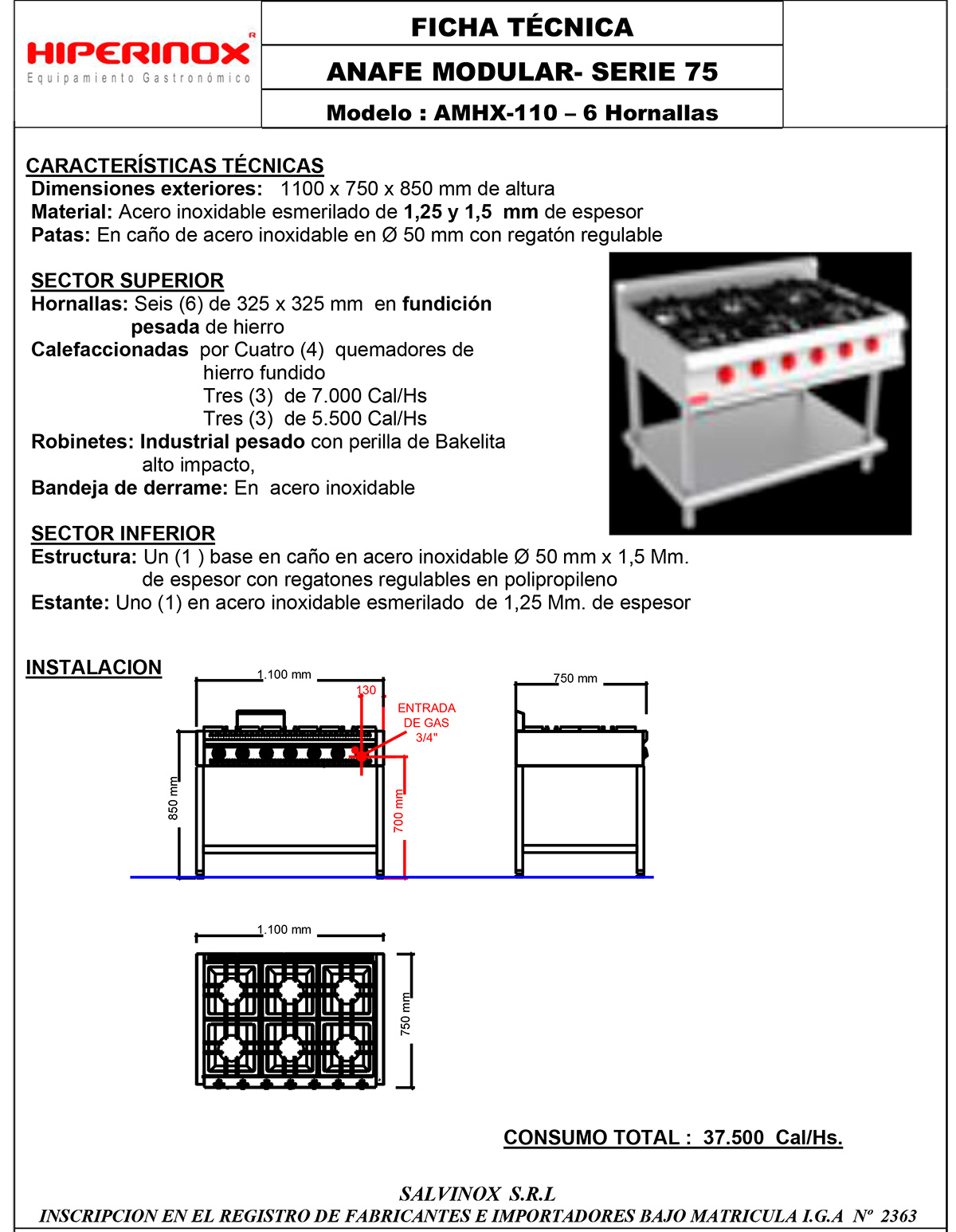 ANAFE MODULAR- AMHX-110 – 6 Hornallas